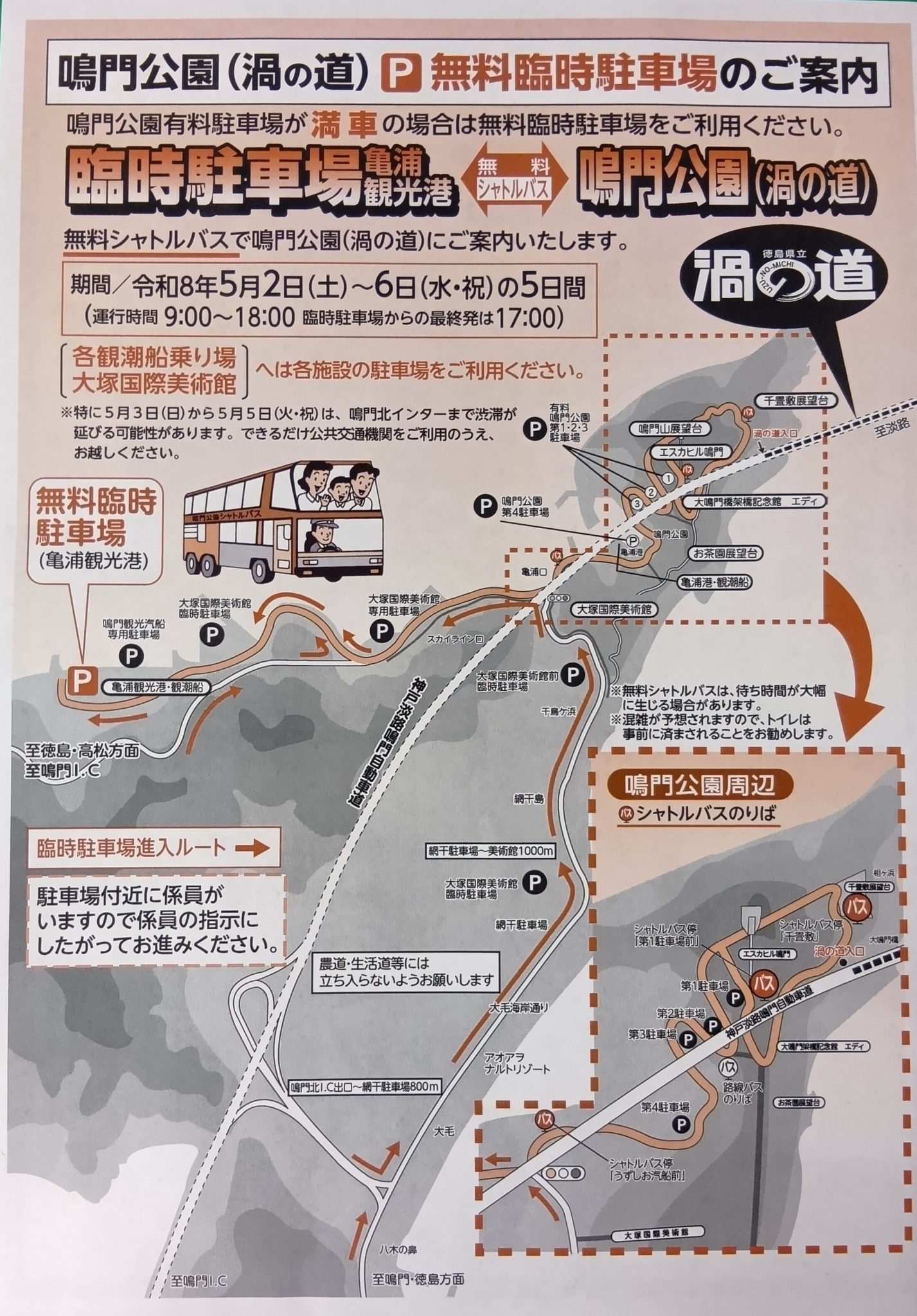 亀浦港埠頭用地に臨時駐車場を設けてシャトルバスを運行し、鳴門公園まで送迎いたします。