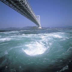 鳴門海峡の潮流はイタリアのメッシーナ海峡、カナダのセイモア海峡とならんで「世界三大潮流」の一つといわれています。潮流の速さは大潮の最大時には、時速20km以上にもなり、日本一の速さといわれています。